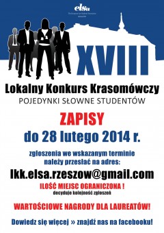 XVIII edycja Lokalnego Konkursu Krasomówczego organizowana jest przez Europejskie Stowarzyszenie Studentów Prawa ELSA Rzeszów. Konkurs odbędzie się 19 marca 2014 r. o godzinie 17:00 w Sali Teatralnej Sądu Okręgowego w Rzeszowie (ul. Plac Śreniawitów 3).