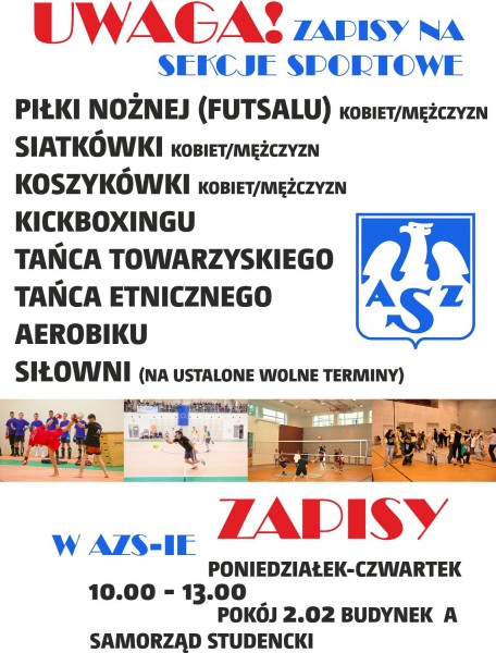 W semestrze letnim studenci będą mieli do wyboru kilka nowych sekcji sportowych. Zapisy odbywają się codziennie od poniedziałku (24.02) do czwartku (27.02) w siedzibie Klubu Uczelnianego AZS (Budynek A, pokój 2.02) w godzinach od 10:00 do 13:00.