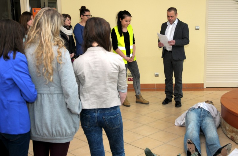 Scenariusz poniedziałkowych zajęć wyglądał następująco. W budynku Collegium Securitatis WSPiA znaleziono ciało mężczyzny. Na miejscu zjawili się: prokurator, technicy kryminalistyki oraz policjanci dochodzeniowo-śledczy. Ich zadaniem było dokonanie oględzin miejsca zdarzenia oraz zebranie jak największej ilości śladów, które pozwolą ustalić, w jaki sposób zginął mężczyzna znaleziony na miejscu przestępstwa.