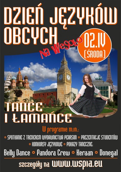 Dzień Języków Obcych pod hasłem „Tańce i łamańce” odbędzie się w najbliższą środę 2 kwietnia 2014 r. w Kampusie Wyższej Szkoły Prawa i Administracji w Rzeszowie. Początek imprezy o 9:30.
