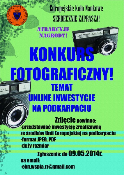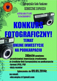 W konkursie fotograficznym pt.: Unijne Inwestycje na Podkarpaciu mogą uczestniczyć wszyscy studenci zarówno studiów stacjonarnych, jak i niestacjonarnych. Jak tłumaczą organizatorzy konkursu, wystarczy pokazać swoją wizję dotacji unijnych w obrazie. Inwestycje unijne są wszędzie. Mosty, lotniska, drogi, boiska, budynki, uczelnie, laboratoria oraz mnóstwo innych inwestycji. To wszystko może być inspiracją dla uczestników konkursu – tłumaczą członkowie Europejskiego Koła Naukowego.