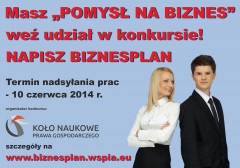Konkurs „Pomysł na biznesplan” przeznaczony jest dla wszystkich studentów WSPiA niezależnie do tego, na jakim kierunku studiują. Jego celem jest znalezienie najlepszych pomysłów na przedsięwzięcia gospodarcze na Podkarpaciu. Aby wziąć udział w konkursie, wystarczy przygotować w dowolnej formie, swój własny biznesplan. Jedynym warunkiem przystąpienia do Konkursu jest doręczenie podpisanej Karty Zgłoszeniowej Koordynatorowi Konkursu. Jest nim mgr Rafał Witkowski, opiekun Koła Naukowego Prawa Gospodarczego działającego w Wyższej Szkole Prawa i Administracji. Prace konkursowe należy wysyłać na adres knpg@wspia.eu. Termin zgłaszania prac upływa 10 czerwca 2014 r.