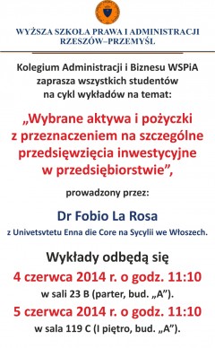 Dr Fobio La Rosa z Univetsvtetu Enna die Core na Sycylii we Włoszech będzie gościem cyklu wykładów dla studentów Wyższej Szkoły Prawa i Administracji. Tematem wykładu będą "Wybrane aktywa i pożyczki z przeznaczeniem na szczególne przedsięwzięcia inwestycyjne w przedsiębiorstwie". Wykłady odbędą się w najbliższa środę (4 czerwca) i czwartek (5 czerwca).