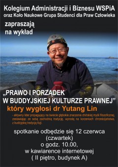 Na spotkanie z dr. Yutang Linem zapraszamy wszystkich studentów WSPiA zainteresowanych kulturą buddyjską. Tematem wykłady będzie „Prawo i porządek w buddyjskiej kulturze prawnej". Wykład odbędzie się w czwartek 12 czerwca o godzinie 10:00 w Starym Klubie Studenckim WSPiA w Rzeszowie w rzeszowskim kampusie Wyższej Szkoły Prawa i Administracji.