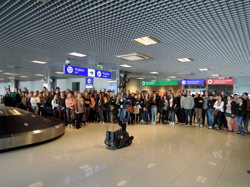 Uczestnicy wykładu na lotnisku odwiedzili również halę przylotów i odlotów, pomieszczenia techniczne i biurowe. Mieli też okazje zobaczyć urządzenia służące do kontroli pasażerów oraz do wykrywania produktów i substancji, których nie można wwozić do Polski. Jednym z punktów wykładu na lotnisku była prezentacja robota pirotechnicznego, który używany jest przez na terenie lotniska. Straż Graniczna zaprezentowała też psa, który szuka narkotyków. Na koniec spotkania studenci zobaczyli, jak wygląda praca funkcjonariuszy Służby Celnej na terenie lotniska. Poznali specyfikę tego zawodu i zagrożenia, jakie niesie ze sobą.
