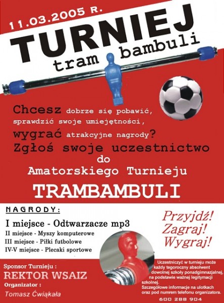 11 marca, w ramach „Dni Otwartych” Zamiejscowego Wydziału Administracyjno-Prawnego w Rzeszowie Wyższej Szkoły Administracji i Zarządzania w Przemyślu, odbędzie się II Amatorski Turniej Trambambuli (piłkarzyków barowych).