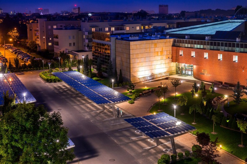 Na terenie kampusu WSPiA uwagę zwracają także zadaszenia, które pojawiły się przed Budynkiem głównym uczelni. – Są to tzw. Car Porty, które mają dwie funkcje. Zamontowano na nich nowoczesne panele fotowoltaiczne. Dzięki temu uczelnia pozyskuje energię elektryczną „ze słońca”. Dodatkowo zadaszenia dają w lecie ochronę przed słońcem, a w zimie przed śniegiem. W ramach inwestycji na naszym parkingu powstały również pierwsze w Rzeszowie stacje do ładowania samochodów elektrycznych – tłumaczy Marek Rogalski, zastępca Dyrektora WSPiA.