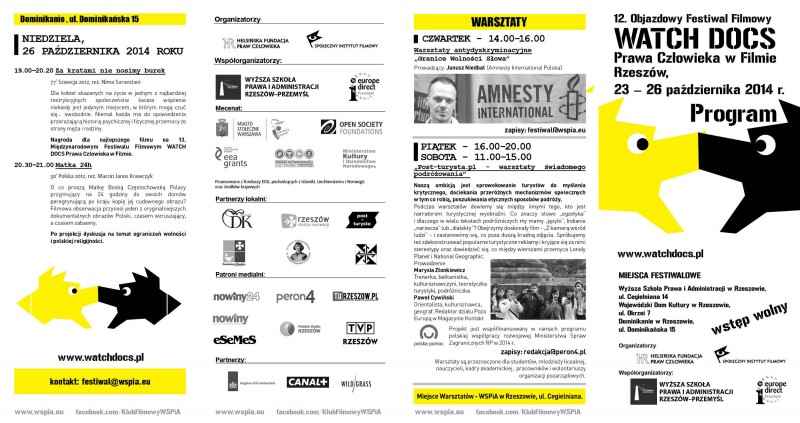 Ogólnopolski Objazdowy Festiwal Filmowy „Watch Docs. Prawa Człowieka w Filmie” potrwa od 23 do 26 października 2014 r. Filmy, przygotowane w ramach festiwalu „Watch Docs” wyświetlane są głównie w Wyższej Szkole Prawa i Administracji. – Dodatkowe projekcje jak co roku zaplanowaliśmy także w Rzeszowskim WDK i u Dominikanów – mówi Grzegorz Krasoń z WSPiA, Koordynator Festiwalu. – Pojawiło się także jedno nowe miejsce. W tegorocznej edycji dołączyło do nas Liceum Ogólnokształcącym w Boguchwale, gdzie również będzie można zobaczyć ciekawe filmy dotyczące tematyki praw człowieka – dodaje Grzegorz Krasoń.