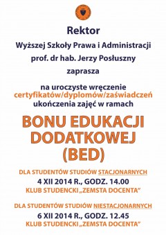 Podczas uroczystości wszyscy studenci, którzy uczestniczyli w pierwszej edycji BED otrzymają certyfikaty, dyplomy oraz zaświadczenia ukończenia wybranych zajęć. Wręczy je prof. Jerzy Posłuszny, Rektor Wyższej Szkoły Prawa i Administracji.