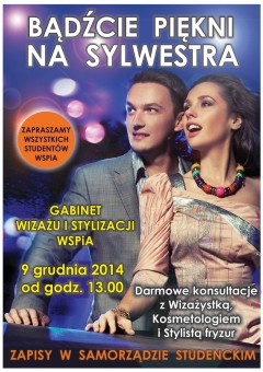 Akcja „Bądźcie piękni na Sylwestra” przeprowadzona zostanie wspólnie z Gabinetem Kosmetyki Leczniczej i Pielęgnacyjnej Małgorzaty Smolnickiej. Z porad Wizażystki, Kosmetologa oraz stylisty fryzur będzie można skorzystać we wtorek 9 grudnia od godziny 13:00 w Gabinecie Wizażu i Stylizacji WSPiA.
