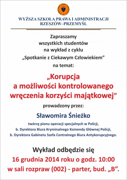 Sławomir Śnieżko to policjant, który specjalizował się zwalczaniu przestępczości zorganizowanej i kryminalnej w ramach pionu operacji specjalnych w Policji. Przez wiele lat pracował w Centralnym Biurze Śledczym, był też Dyrektorem Biura Kryminalnego Komendy Głównej Policji oraz Dyrektorem Gabinetu Szefa Centralnego Biura Antykorupcyjnego. Do Rzeszowa przyjedzie na zaproszenie Wyższej Szkoły Prawa i Administracji. Podczas swojej wizyty spotka się ze studentami WSPiA podczas wykładu z cyklu „Spotkania z ciekawym człowiekiem” oraz ze studentami koła naukowego bezpieczeństwa wewnętrznego „Pro Securitate” Tematem wykładu będzie „Korupcja a możliwości kontrolowanego wręczenia korzyści majątkowej”.
