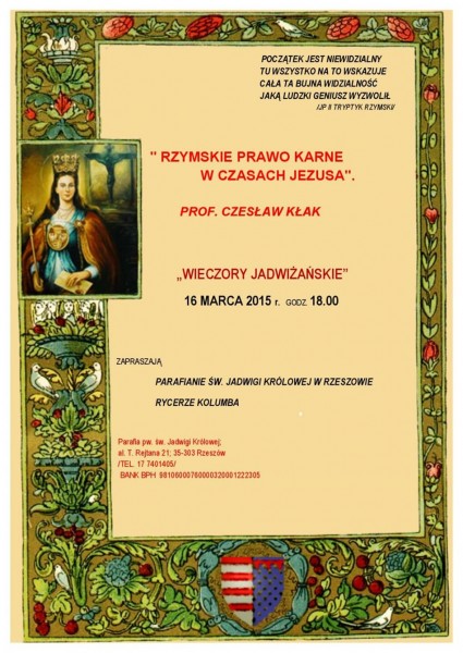 Do wysłuchania wykładu prof. Czesława Kłaka pt. „Rzymskie Prawo Karne w czasach Jezusa” zapraszamy wszystkie osoby zainteresowane tematyką historii Prawa. Początek już dziś (poniedziałek 16 marca 2015 r.) o godzinie 18:00 w Międzynarodowym Studenckim Centrum Kultury Chrześcijańskiej przy Al. T. Rejtana 21 w Rzeszowie (Kościół Akademicki).