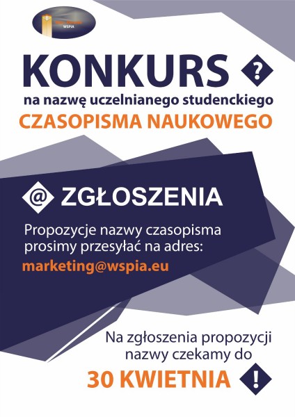 Aby zgłosić swoją propozycję nazwy Uczelnianego Studenckiego Czasopisma Naukowego, wystarczy wysłać ją na adres marketing@wspia.eu. W tytule wiadomości należy wpisać słowo "czasopismo". Na wszystkie zgłoszenia czekamy do czwartku 30 kwietnia 2015 r. Do wygrania nagrody niespodzianki.