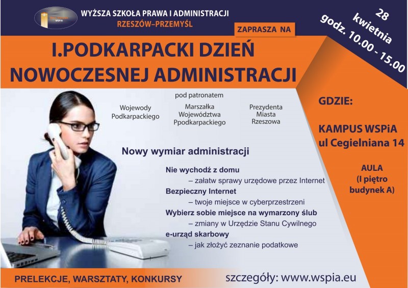 „I Podkarpacki Dzień Nowoczesnej Administracji” odbędzie się w najbliższy wtorek 28 kwietnia 2015 r. w godzinach od 10:30 do 15:00 w rzeszowskim kampusie Wyższej Szkoły Prawa i Administracji przy ul. Cegielnianej 14. Wydarzenie honorowym patronatem objął Wojewoda Podkarpacki, Marszałek Województwa oraz Prezydent Miasta Rzeszowa.