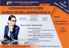 Celem organizowanego przez Wyższą Szkołę Prawa i Administracji I Podkarpackiego Dnia Nowoczesnej Administracji jest przedstawienie uczniom szkół ponadgimnazjalnych oraz studentom nowoczesnego oblicza administracji otwartej na obywatela i nowych technologii i formy komunikacji społecznej. W ostatnich latach zauważyć można dynamiczne zamiany w organizacji i funkcjonowaniu administracji rządowej i samorządowej. Praktycznie codziennie różne urzędy wdrażają nowoczesne technologie informatyczne, upowszechnianie nowych form komunikacji pomiędzy urzędem a obywatelami, instytucjami i podmiotami gospodarczymi. Rozwój internetu oraz powszechność nowoczesnych technologii i komunikacji staje się siłą napędową budowania interaktywnej administracji publicznej, co szczególnie dostrzegamy na Podkarpaciu.