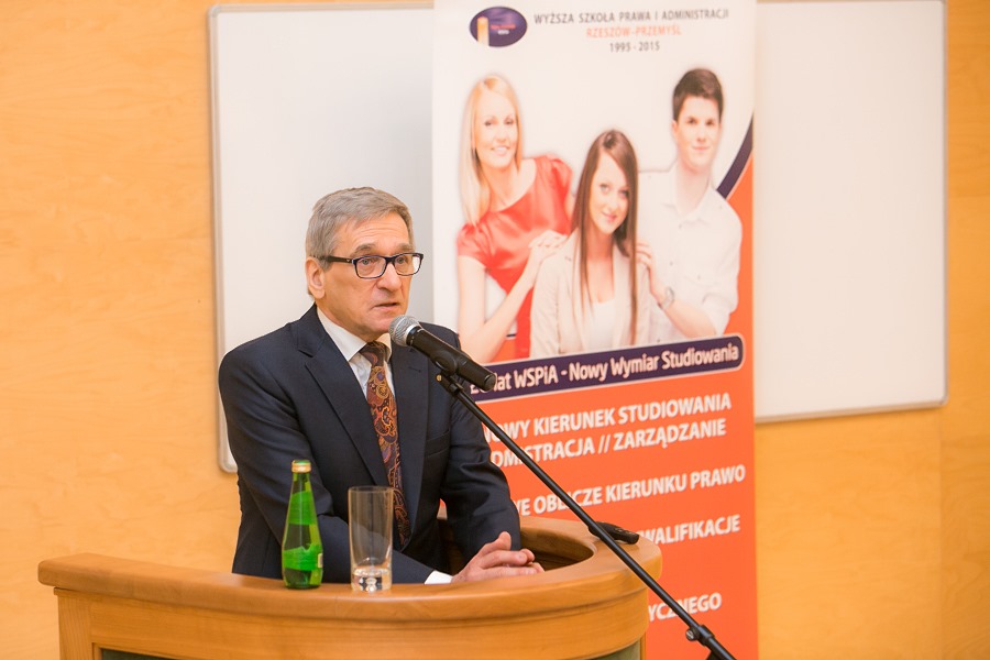 Dodał, że jako uczelnia kształcąca na kierunku „administracja” WSPiA mocno przygląda się administracji. – I tu należy zaznaczyć, że rozwiązania, które wprowadza się w Podkarpackich Urzędach, cieszą się doskonałą opinią. W naszym regionie wdrożonych zostało wiele nowoczesnych elektronicznych rozwiązań, dzięki którym nasz region stał się prekursorem e-administracji. Dzięki temu nie jesteśmy już postrzegani jako zaścianek, ale region nowoczesny, który nie odstaje od innych – mówił Rektor WSPiA. Prof. Jerzy Posłuszny tłumaczył również uczniom szkół ponadgimnazjalnych, żeby traktowali administrację nie jako organizatora życia, ale jako instytucję, która służy życiu obywatela.