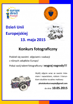 W konkursie fotograficznym pt.: Podziel się swoim zdjęciem z wakacji z różnych zakątków Europy może uczestniczyć każdy studenci WSPiA zarówno studiów stacjonarnych, jak i niestacjonarnych. Wystarczy przesłać fotografię, na której pokazane zostały miejsca turystyczne w wybranym kraju UE. Rozstrzygnięcie konkursu odbędzie się 13 maja 2015 r. podczas organizowanego w Wyższej Szkole Prawa i Administracji Dnie Unii Europejskiej pod hasłem „Europejski Dzień Obywatelski”. NA zwycięzców Czekaja cenne nagrody niespodzianki.