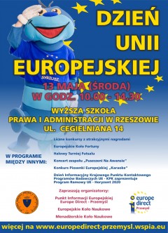 Dzień Unii Europejskiej pod hasłem „Europejski Dzień Obywatelski” odbędzie się w środę 13 maja 2015 r. w kampusie Wyższej Szkoły Prawa i Administracji przy ul. Cegielnianej 14 w Rzeszowie. Organizatorem imprezy jest Europejskie Koło Naukowe, Menedżerskie Koło Naukowe oraz działający przy WSPiA Punkt Informacji Europejskiej Europe Direct Przemyśl.