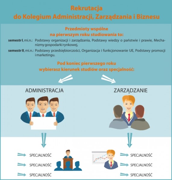 Na kierunku zarządzanie kandydaci mają do wyboru 5 specjalności: Zarządzanie turystyką, Zarządzanie w biznesie, Finanse i rachunkowość, Zarządzanie finansami, Zarządzanie zasobami ludzkimi. Na kierunku administracja kandydaci mają do wyboru 13 specjalności wśród nich dwie NOWE: Stosunki międzynarodowe oraz Zarządzanie transportem – spedycją – logistyką.