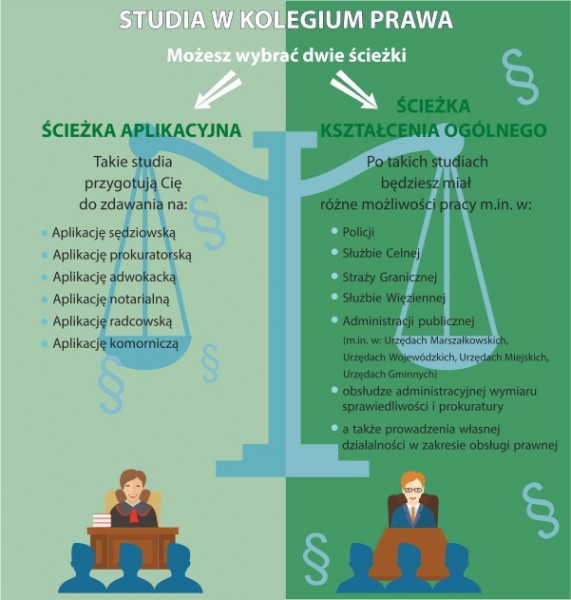 NOWOŚCI dotyczą również kierunku „prawo” prowadzonego przez Kolegium Prawa WSPiA. Polegają one na stworzeniu dwóch profili kształcenia oraz daleko idącym upraktycznieniu zajęć. Pierwszy profil adresowany jest do osób chcących zdawać na aplikację (m.in.: sędziowską, prokuratorską, adwokacją, radcowską). Drugi dla osób, które są zainteresowane inną drogą kariery prawniczej (m.in.: doradztwem prawnym, doradztwem podatkowym, pracą w służbach mundurowych itp.). Dodatkowo kandydaci na studia mogą wybrać jedną z dwóch indywidualnych ścieżek kształcenia: pierwsza o profilu cyberprzestępczość, druga o profilu kryminalistyka.