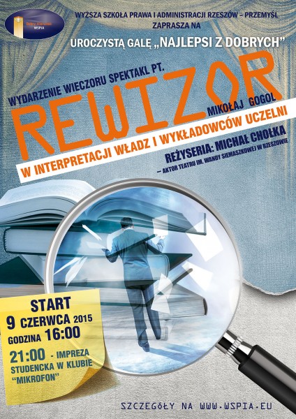 Sztuka pt. „Rewizor” będzie częścią uroczystej Gali „Najlepsi z dobrych”. Podczas imprezy organizowanej już po raz trzeci nagrodzeni zostaną najlepsi studenci Wyższej Szkoły Prawa i Administracji. W nagrodę otrzymają statuetki oraz stypendia specjalne dla najlepszych studentów WSPiA. W czasie Gali nagrodzeni zostaną również najsympatyczniejsi wykładowcy i studenci uczelni. Gala „Najlepsi z dobrych” organizowana jest, aby wyróżnić najlepszych studentów Wyższej Szkoły Prawa i Administracji. Ma to być dla nich nagrodą i motywacją do dalszej pracy zarówno naukowej, jak i społecznej na rzecz uczelni.