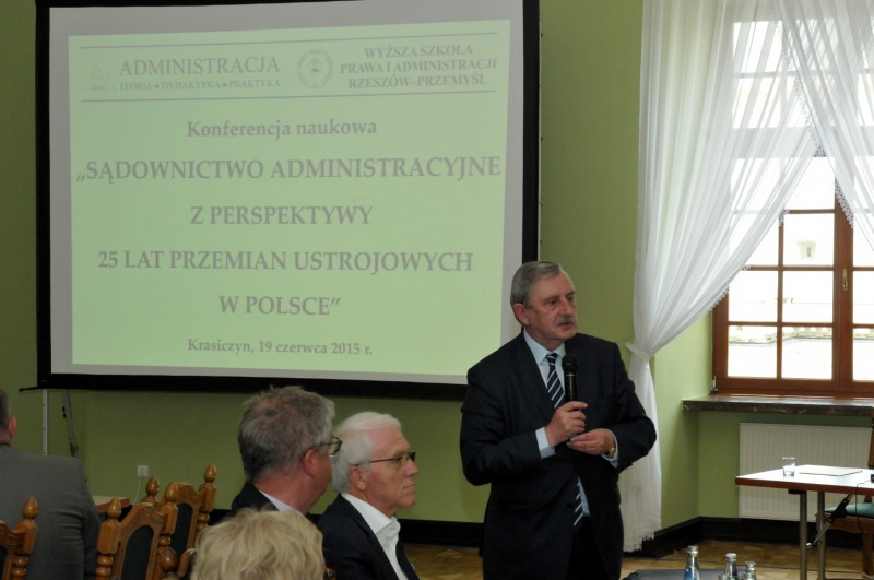 – Temat tegorocznej dyskusji jest nieprzypadkowy. Mija bowiem 25 lat przemian ustrojowych w wolnej Polsce. Jednym z najważniejszych osiągnięć tych przemian jest właśnie Sądownictwo Administracyjne. Śmiało można powiedzieć, że jest to filar naszej wolności i znak przemian, jakie dokonały się w naszym kraju. Bardzo się cieszę, że w konferencji uczestniczy prof. Roman Hauser, Prezes NSA, który od 25 lat bardzo mocno związany jest z sądownictwem administracyjnym w Polsce. Są również sędziowie NSA i WSA, którzy są wykładowcami WSPiA. Są to osoby, które doskonale potrafią podsumować 25 lat Sądownictwa Administracyjnego w Polsce i pokazać, że jest to jeden z największy sukcesów naszej transformacji ustrojowej – mówił podczas rozpoczęcia konferencji prof. Jerzy Posłuszny, Rektor WSPiA.