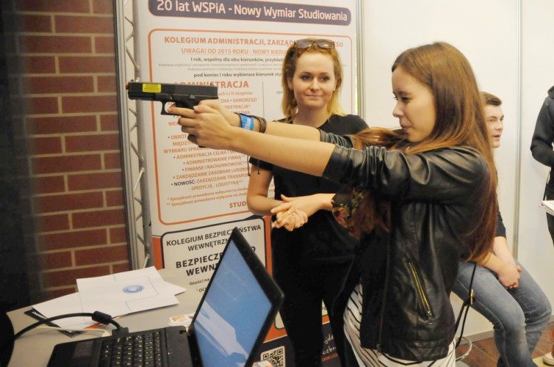 Na Salon Maturzystów Wyższej Szkoły Prawa i Administracji przygotowała dla zwiedzających wiele atrakcji. Na naszym stoisku prezentowane była najnowocześniejsza na Podkarpaciu uczelniana strzelnica elektroniczna oraz część nowoczesnego wyposażenia uczelnianego laboratorium kryminalistycznego WSPiA. Dzięki temu każdy odwiedzający targi mógł spróbować swoich sił, strzelając z repliki broni Glok 17 oraz poznać różne techniki kryminalistyczne. Studenci z Koła Naukowego Kryminalistyki i Kryminologii przygotowywali pamiątkowe karty daktyloskopijne oraz opowiadali o zaletach kierunku „bezpieczeństwo wewnętrzne” i „prawo”.