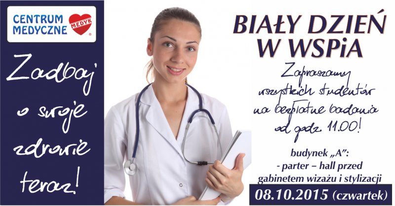 Z bezpłatnych porad i badań mogą skorzystać wszyscy studenci uczący się w WSPiA. Specjaliści będą przyjmować w czwartek 8 października 2015 r. od godziny 12:00. Z porad będzie można skorzystać w budynku „A” na parterze przed gabinetem wizażu i stylizacji.