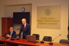 Zgodził się z nim prof. Jerzy Posłuszny, Rektor Wyższej Szkoły Prawa i Administracji. Według niego obecna Ustawa o Szkolnictwie Wyższym, zamiast pomagać i wspierać, staje się przeszkodą w prowadzeniu Uczelni i kształceniu studentów. – Jest ona zbyt zagmatwana i wprowadza wiele niepotrzebnych przepisów. Na przykład Uczelnie niepubliczne takie jak WSPiA pomimo braku finansowania z budżetu państwa muszą składać do ministerstwa sprawozdania finansowe, które są wnikliwie sprawdzane. Wiele problemów przysporzyły także przepisy dotyczące Krajowych Ram Kwalifikacyjnych – mówił podczas spotkania prof. Jerzy Posłuszny, Rektor WSPiA.