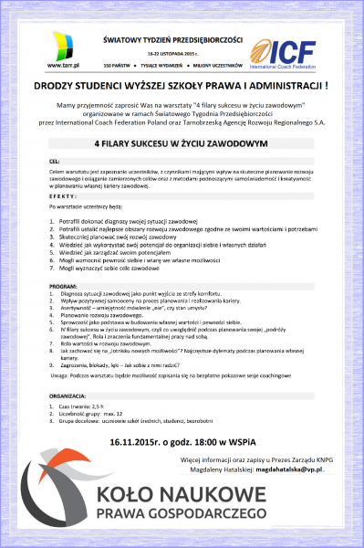 Warsztaty „4 filary sukcesu w życiu zawodowym” organizowane są w ramach rozpoczynającego się Światowego Tygodnia Przedsiębiorczości. Na spotkanie zapraszamy w najbliższy poniedziałek 16 listopada 2015 r. o godzinie 18:00 Sali 119 B (bud. A). Szczegółowe informacje można uzyskać u Prezes Zarządu Koła Naukowego Prawa Gospodarczego Magdaleny Hatalskiej (magdahatalska@vp.pl).