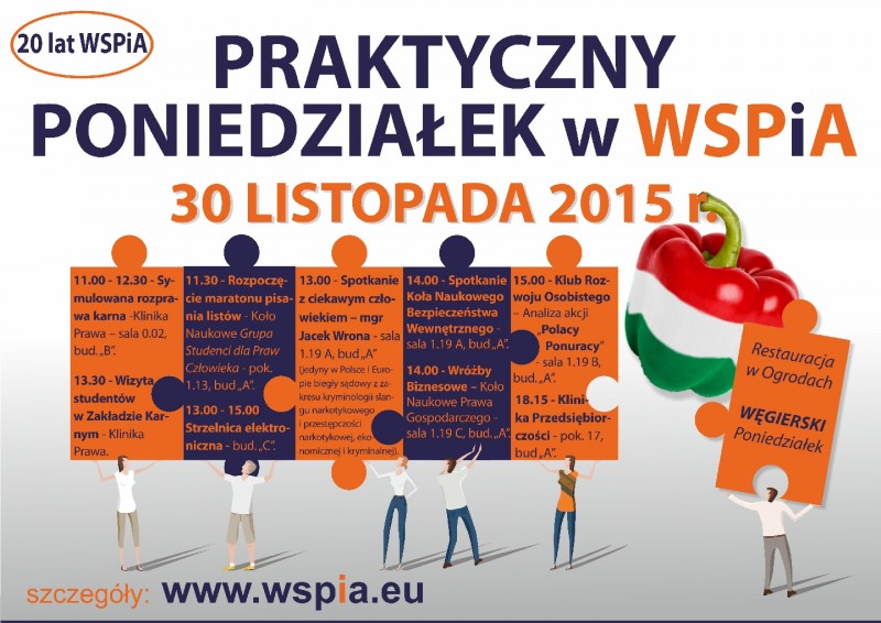Praktyczny Poniedziałek to nowe przedsięwzięcie WSPiA, które ma stworzyć studentom możliwość dodatkowej aktywności. Dzięki temu studenci mogą realizować swoje zainteresowania wykraczające poza formułę klasycznych zajęć akademickich. Dlatego Uczelnia proponuje im interesującą ofertę spędzania początku tygodnia w przyjemny i pożyteczny sposób. W każdy poniedziałek organizowane są różne formy aktywności odpowiadające zainteresowaniom studentów.