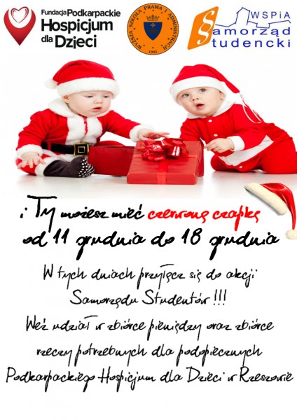 Jak co roku przed świętami Bożego Narodzenia Studenci WSPiA postanowili wesprzeć najbardziej potrzebujących podopiecznych Fundacji Podkarpackie Hospicjum dla dzieci. Podczas akcji „I ty możesz mieć czerwoną czapkę” zbierane będą głównie dary wskazane przez Hospicjum. Są to: