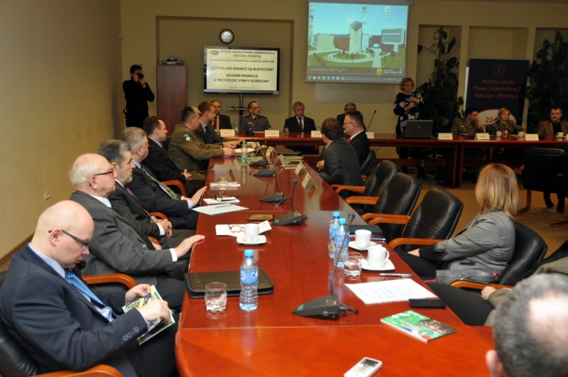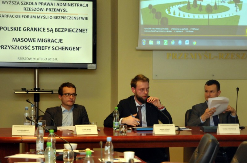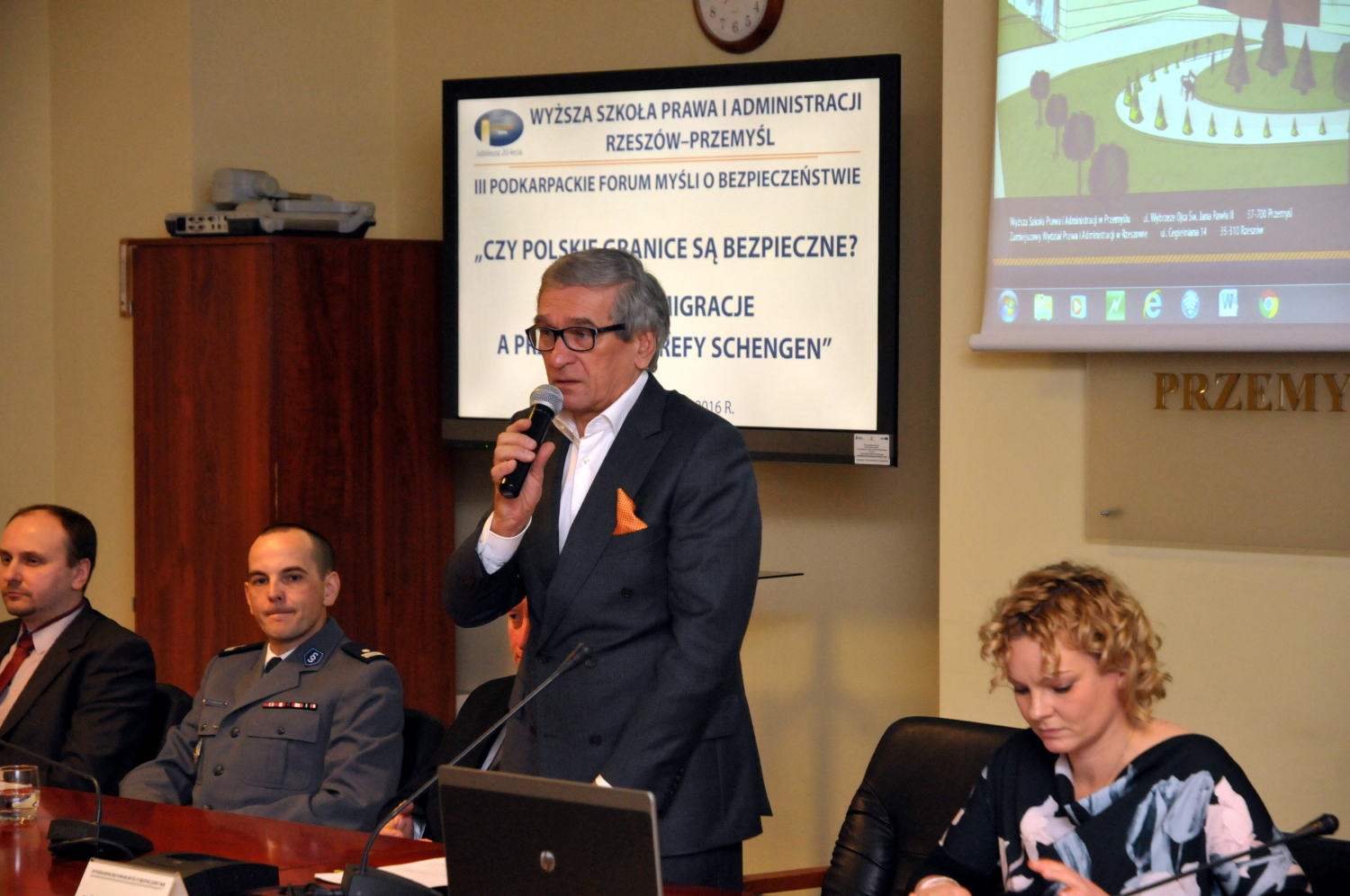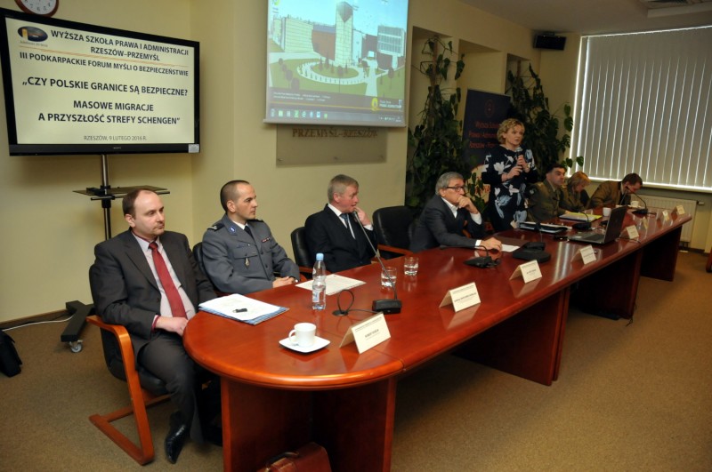 Dyskusja w ramach III. Podkarpackiego Forum Myśli o Bezpieczeństwie odbyła się pod hasłem "Czy polskie granice są bezpieczne? Masowe migracje a przyszłość Strefy Schengen". Jak tłumaczył na początku dyskusji prof. Jerzy Posłuszny, Rektor WSPiA temat migracji, który dziś pojawia się na Forum Myśli o Bezpieczeństwie, jest bardzo ważny i aktualny. – Wybór tematu do dyskusji w ramach Forum nie jest przypadkowy. Od kilku lat, jako uczelnia akademicka z ambicjami naukowymi, posiadająca uprawnienia do nadawania stopni naukowych staramy się realizować funkcje nie tylko dydaktyczne. Dlatego stworzyliśmy Forum wymiany myśli i poglądów często kontrowersyjnych pomiędzy szeroko pojętą teorią a praktyką. Tematem wzbudzającym ożywioną dyskusję jest właśnie temat kryzysu migracyjnego w całej Europie. Mam nadzieję, że wnioski z państwa spotkania, tak jak w wielu wcześniejszych przypadkach zostaną wzięte pod uwagę na odpowiednich forach prawodawczych czy politycznych – mówił podczas otwarcia konferencji prof. Jerzy Posłuszny.