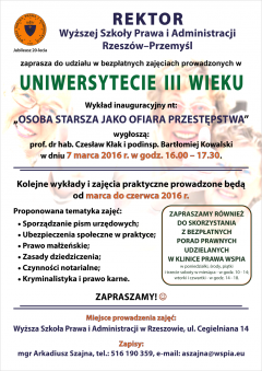 Pierwsze inauguracyjne zajęcia w ramach Uniwersytetu III wieku w WSPiA odbędą się w najbliższy poniedziałek 7 marca 2016 r. o godzinie 16:00. Podczas spotkania Seniorzy będą mogli wysłuchać wykładu pt. „Osoba starsza, jako ofiara przestępstwa”. Wygłoszą go prof. Czesław Kłak, Dyrektor Kolegium Prawa w WSPiA oraz i podinsp. Bartłomiej Kowalski, Naczelnik wydziału ds. walki z przestępczością zorganizowaną Komendy Wojewódzkiej Policji w Rzeszowie.