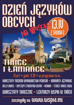 Organizatorem „Dnia Języków Obcych”, jak co roku jest działający w WSPiA Zespół Języków Obcych. W tym roku w programie przewidziano wiele atrakcji. Impreza rozpocznie się o godzinie 9:30 warsztatami z Anną Kolbuszewską, trenerem wydawnictwa Pearson. Zorganizowany zostanie także konkursy: Tongue Twisters i Czy rozmowliajesz ty polskoju mowoju?. Będą to tzw. łamańce językowe oraz konkurs jezyka polskiego. Na tę cześć imprezy zapraszamy do Auli WSPiA.