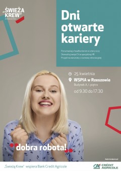 Świeża Krew Do Pierwszej Pracy to program mentorski, który wspiera zawodowy start studentów! Inicjatorem akcji jest bank Credit Agricole. Akcję po raz pierwszy w Rzeszowie organizuje Akademickie Biuro Karier Wyższej Szkoły Prawa i Administracji. Będzie to część kolejnego Praktycznego Poniedziałku w WSPiA.