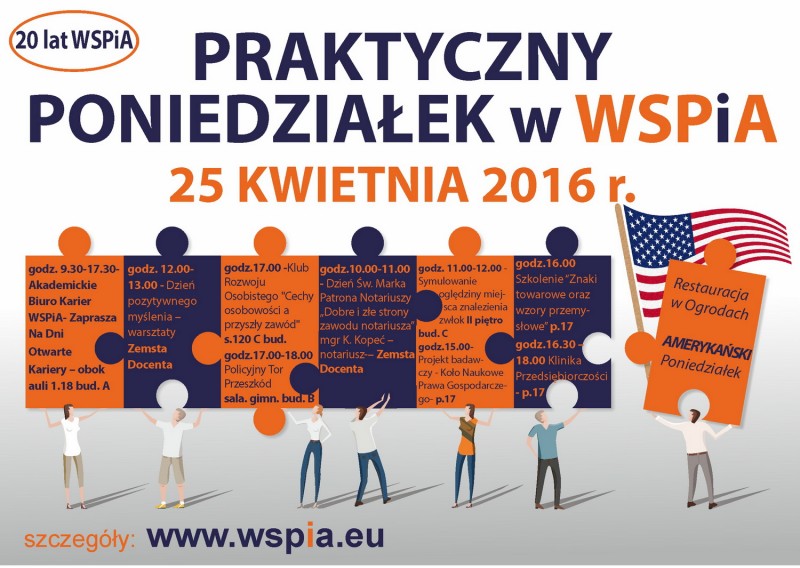 Jest to nowe przedsięwzięcie WSPiA, które ma stworzyć studentom możliwość dodatkowej aktywności. Dzięki temu studenci mogą realizować swoje zainteresowania wykraczające poza formułę klasycznych zajęć akademickich. Dlatego Uczelnia proponuje im interesującą ofertę spędzania początku tygodnia w przyjemny i pożyteczny sposób. W każdy poniedziałek organizowane są różne formy aktywności odpowiadające zainteresowaniom studentów.