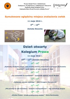 Dzień Otwarty Kolegium Prawa WSPiA rozpoczną przygotowane przez studentów symulowane oględziny miejsca znalezienia zwłok. Inscenizacja z wykorzystaniem fantomów i walizek śledczych z Laboratorium Kryminalistycznego WSPiA rozpocznie się o godzinie 9:00 w klubie studenckim WSPiA Zemsta Docenta. Uczestnicy symulacji będą mogli poznać zasady pracy techników kryminalistycznych oraz prokuratora na miejscu przestępstwa. Zobaczą m.in., jak zbierane i zabezpieczane są różne ślady znalezione przy ofierze.