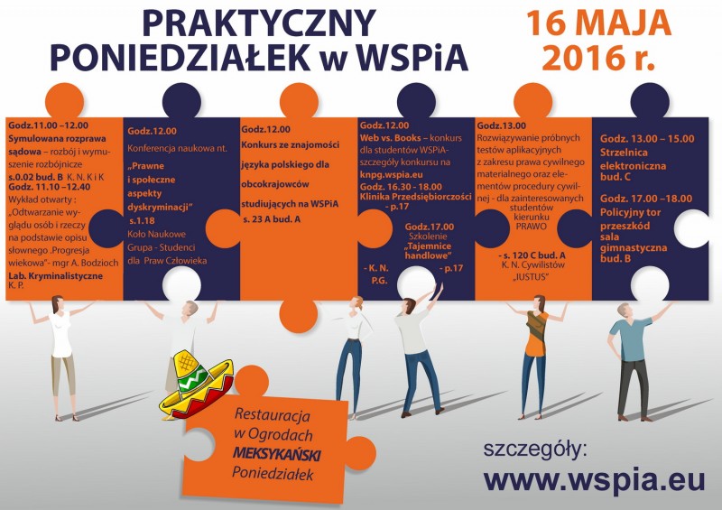 Jest to nowe przedsięwzięcie WSPiA, które ma stworzyć studentom możliwość dodatkowej aktywności. Dzięki temu studenci mogą realizować swoje zainteresowania wykraczające poza formułę klasycznych zajęć akademickich. Dlatego Uczelnia proponuje im interesującą ofertę spędzania początku tygodnia w przyjemny i pożyteczny sposób. W każdy poniedziałek organizowane są różne formy aktywności odpowiadające zainteresowaniom studentów.