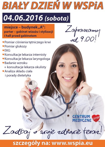 Do udziału w Białej Sobocie w WSPiA zapraszamy w sobotę 4 czerwca 2016 r. od godziny 9:00 do 14.00. Z porad lekarzy będzie można skorzystać w budynku „A” na parterze przed gabinetem wizażu i stylizacji.