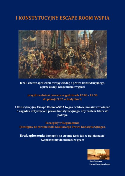 Aby wziąć udział w I Konstytucyjnym Escape Room'u w WSPiA należy wypełnić zgłoszenie dostępne na stronie Koła Naukowego Prawa Konstytucyjnego lub w Dziekanacie. Tam też można znaleźć szczegółowe informacje oraz regulamin konkursu.