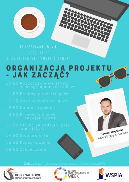 Tydzień Przedsiębiorczości w WSPiA Rzeszowskiej Szkole Wyższej zakończy szkolenie z organizacji projektów. W czasie 6-cio godzinnego spotkania jego uczestnicy będą mogli poznać zastosowanie czterech podstawowych narzędzi w pracy projektowej. Jest to analiza interesariuszy, formułowanie celów w projekcie, tworzenie struktury podziału prac oraz sieci projektu. Szkolenie poprowadzi Tomasz Olejniczak, MBA, Project & Program Manager. Na co dzień pomaga swoim Project Managerom skutecznie inicjować, planować i realizować projekty. Współpracował m.in. z Santander Consumer Bank oraz Europejskim Funduszu Leasingowym S.A. będącym częścią grupy Credit Agricole. Obecnie pracuje dla KRUK S.A. gdzie razem z grupą pasjonatów współtworzy prawdopodobnie najlepsze PMO w sektorze finansowym. Posiada wiedzę i doświadczenie w zakresie stosowania dobrych praktyk: PRINCE2@, IMPA, M_o_R, P30, MSP, KAIZEN. Szkolenie z organizacji projektów odbędzie się w sobotę 19 listopada 2016 r. w godzinach od 10:00 do 16:00.