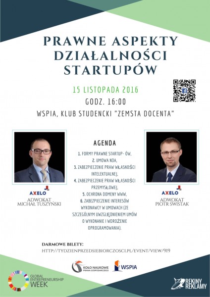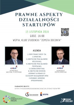 We wtorek 15 listopada poznać będzie można prawne aspekty działalności startupów. O godzinie 16.00 z uczestnikami Tygodnia Przedsiębiorczości spotkają się Piotr Świstak i Michał Tuszyński, adwokaci z kancelarii AXELO. Goście WSPiA opowiedzą m.in. o formach prawnych startupów, zabezpieczeniu praw własności intelektualnej i przemysłowej i ochronie domen www.