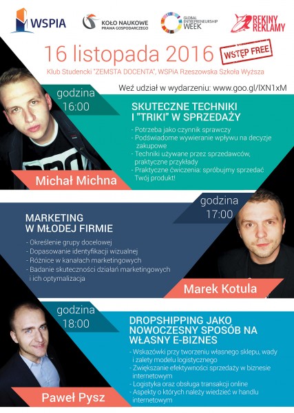 WSPiA Rzeszowska Szkoła Wyższa włączy się w tę inicjatywę już po raz drugi. Przez cały tydzień Klinika Przedsiębiorczości WSPiA zaprasza na serię warsztatów i spotkań z praktykami biznesu. Wszystkie wydarzenia są bezpłatne i odbywać się będą w klubie studenckim WSPiA „Zemsta Docenta”.