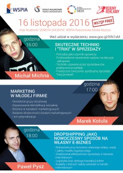 Najwięcej spotkań, bo aż 3 zaplanowano na środę 16 listopada. O godzinie 16:00 poznać będzie można skuteczne techniki i triki w sprzedaży. Prelegentem będzie Michał Michna, dystrybutor Roboclean, współwłaściciel w Agencji Rekiny-Reklamy.pl. Od 10 lat związany ze sprzedażą i jej tajnikami, od 4 lat zapalony przedsiębiorca, od 2 lat trener skutecznej sprzedaży bezpośredniej.