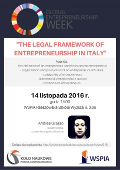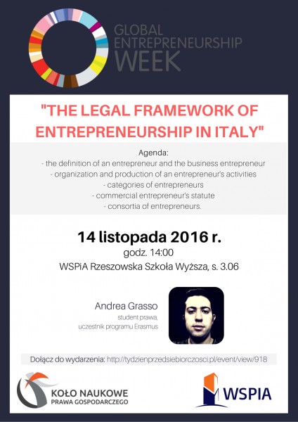 Tydzień Przedsiębiorczości w WSPiA rozpocznie się w poniedziałek 14 listopada o godzinie 14:00 spotkaniem z Andrea Grasso. Jest to student Università Suor Orsola Benincasa di Napoli studiujący w ramach programu Erasmus w WSPiA. Opowie o ramach prawnych przedsiębiorczości we Włoszech.