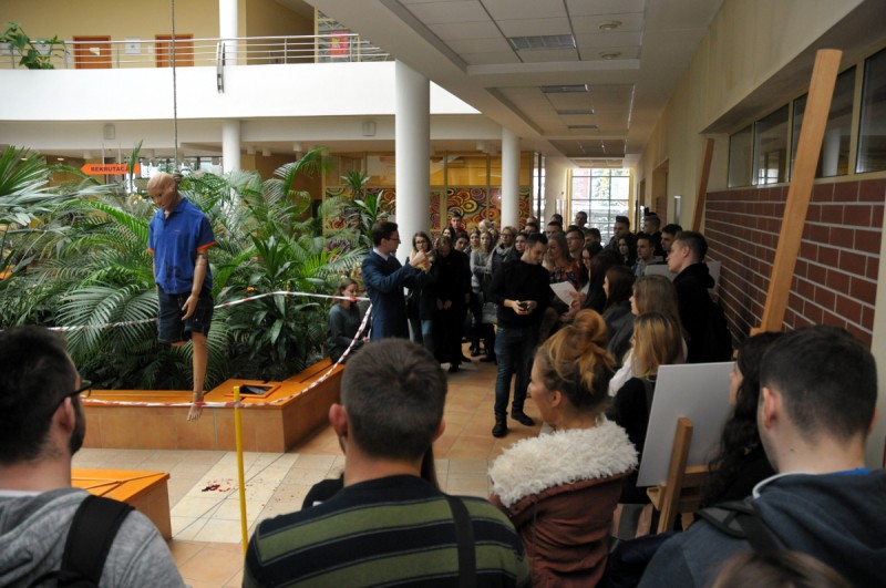 Wisielec w Patio WSPiA pojawił się w ramach praktycznych zajęć dla studentów. Poprowadzili je prof. Czesław Kłak, Dyrektor Kolegium Prawa oraz mgr Arkadiusz Szajna z Katedry Prawa Karnego WSPiA. W ramach symulacji przeprowadzone zostały oględziny miejsca znalezienia zwłok.