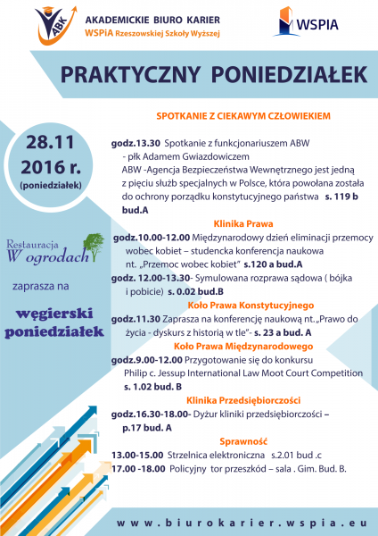 Jest to nowe przedsięwzięcie WSPiA, które ma stworzyć studentom możliwość dodatkowej aktywności. Dzięki temu studenci mogą realizować swoje zainteresowania wykraczające poza formułę klasycznych zajęć akademickich. Dlatego Uczelnia proponuje im interesującą ofertę spędzania początku tygodnia w przyjemny i pożyteczny sposób. W każdy poniedziałek organizowane są różne formy aktywności odpowiadające zainteresowaniom studentów.