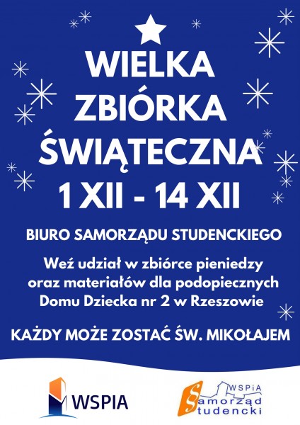 Zbiórka pod hasłem „Każdy może zostać Świętym Mikołajem” potrwa do środy 14 grudnia 2016 r. dary oraz pieniądze można przynosić do siedziby Samorządu Studenckiego WSPiA (pokoju 2.02, Budynek A, obok starego klubu studenckiego). Wszystkie zebrane pieniądze przeznaczone zostaną na zakup potrzebnych produktów. Dary przekazane zostaną potrzebującym dzieciom przed świętami Bożego Narodzenia.