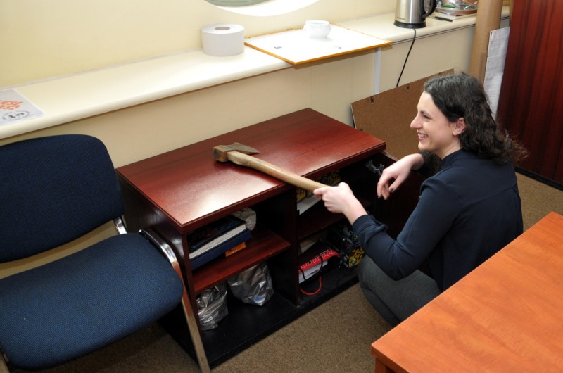 Na pierwszą drużynę w patio czekała krwawa strzałka wskazująca punkt ksero. Tam znaleźli podanie do Dziekana z krwawą odbitką palca. Ten trop zaprowadził ich do gabinetu Dziekana, gdzie znaleźli poprawione podanie z prośbą o przyspieszenie terminu rozprawy i odpowiedzią, że „rozprawa zostanie przeprowadzona natychmiastowo”. Wskazówka prowadziła do Sali rozpraw i informacji, iż z powodu awarii komputera rozprawę przeniesiono do miejsca, gdzie komputerów jest więcej – opowiada Magdalena Trzaska.
